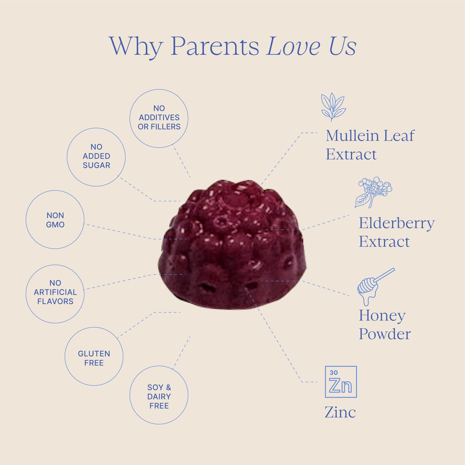 A proprietary blend of: Mullein Leaf Extract, Elderberry Extract, Quercetin, Zinc, Vitamin C, Honey Powder, Vitamin D3, Calcium Carbonate.
