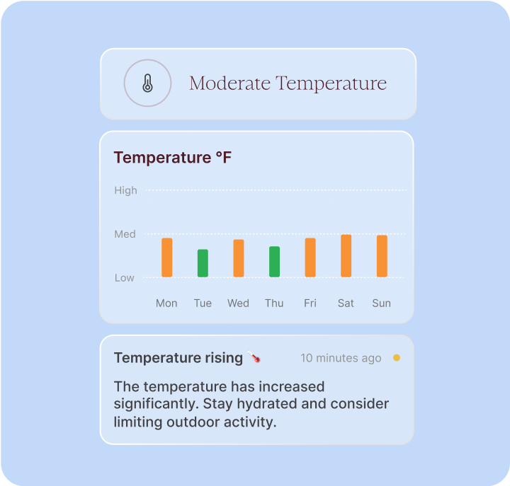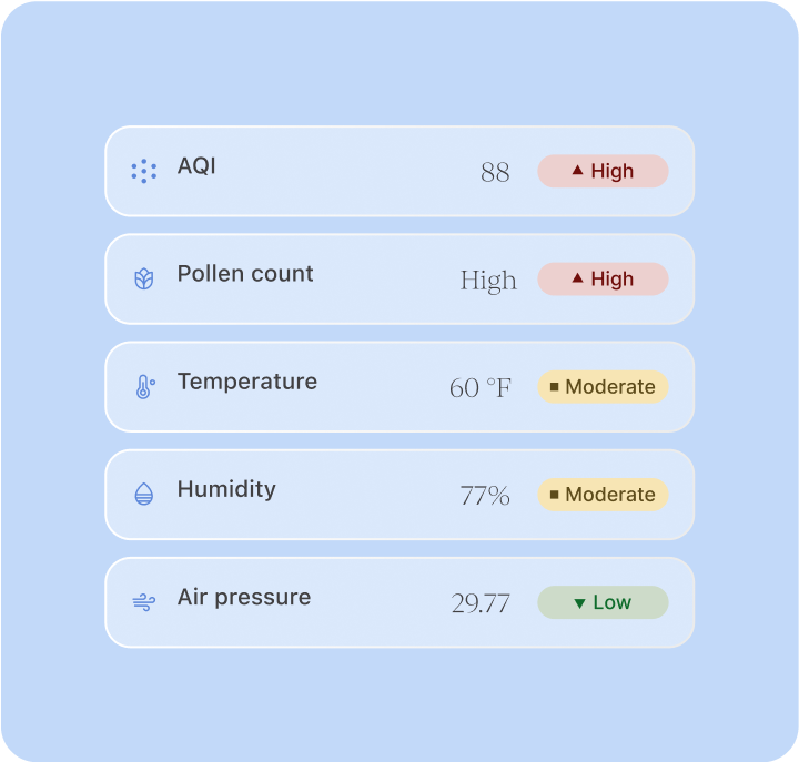 - Local outdoor environmental data: air temperature, pressure, humidity, air quality, and pollen levels