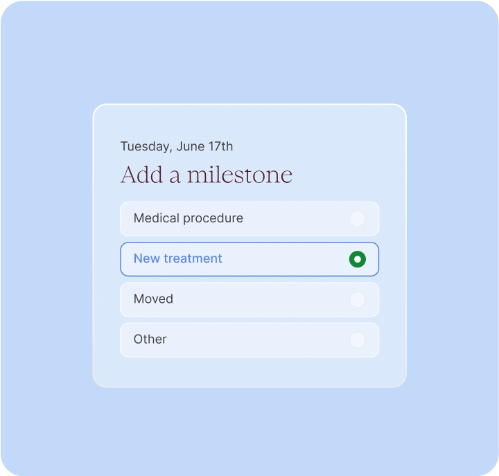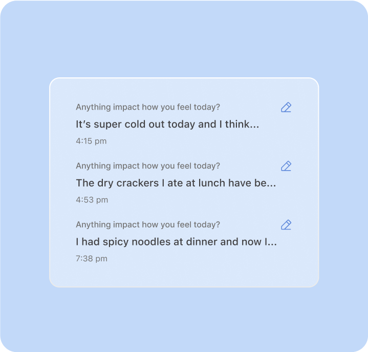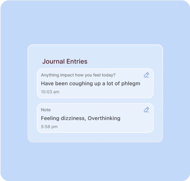 Stay on top of your wellbeing. Log symptoms, track behavioral and environmental factors, and set care related milestones – all in one place.